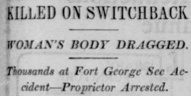 Several thousand pleasure seekers at Fort George, and other spectators on the Speedway, saw a young woman jolted out of a swiftly speeding car on a switchback railway at 193rd Street and Amsterdam Avenue yesterday afternoon, and her body dragged up and down the inclines until she was killed. The switchback is on the side of a steep hill running from the Speedway up to Amsterdam Avenue, and the accident was in plain sight of persons who were only a few feet away, but helpless to attempt a rescue.