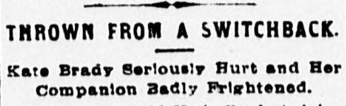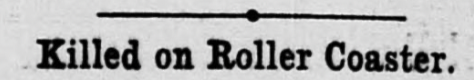 They entered a car on one of these structures and were whisked along until halfway down the incline when Katie pitched headlong out of the car. Her companion was so paralyzed by fear that he made no attempt to save her, and Katie whirled through space for a distance of nearly 30 feet and struck the ground with terrible force.