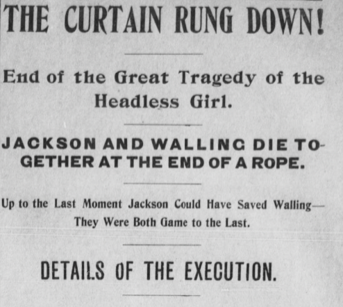 Walling went to sleep at 1 o’clock and slumbered until 6 o’clock. Jackson slept but little. From that early hour until the final announcement that both must hang at 11:30, the prisoners sat at the jail facing the crowded courthouse yard, with every appearance of unconcern.