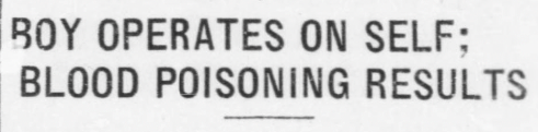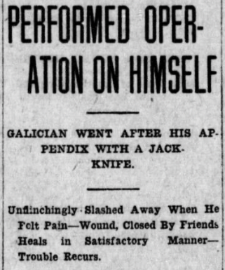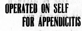 “Carlyle Goldsmith, a young farmer, operated on himself for acute appendicitis and is on the way to recovery.
