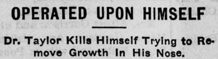 “Dr. Oscar Taylor, of Berkeley, is dead at the Lan Hospital as the result of an operation that he performed himself for the removal of a growth in the nose. He had operated on himself twice before with partial success, but the third time he hit the chisel too hard and caused it to pierce the base of his brain.”