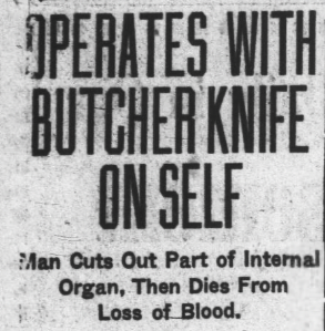Next we have a gruesome report from Ohio in 1923 that tells of a man who, overwhelmed by pain, turned to a butcher knife for relief.