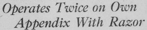 “The operation came abruptly to an end when Goldsmith fainted and fell from his bed to the floor on his face. Mrs. Goldsmith telephoned her neighbors for help. Ten minutes later, [the doctor] arrived. The physician dressed the wound. The appendix was removed. No complications have ensued.”