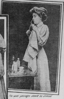 After the reign of the broom all nasal passages should be thoroughly cleansed of the irritating particles of dust. A weak solution of peroxide of hydrogen or of salt and water is within everyone’s reach. The atomizer is effectual in this step.