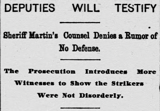 Sheriff James Martin and seventy-three deputies were indicted for murder. The trial drew national attention. Witnesses testified that the miners had been unarmed. That they had been shot while fleeing. That the deputies fired in volleys.
